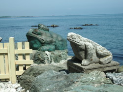 二見興玉神社(ふたみおきたまじんじゃ)は、三重県伊勢市二見町江にある神社である 境内の磯合にある夫婦岩でよく知られおり 旧社格は村社で、現在は神社本庁が定めた、神社本庁が包括している神社である 夫婦岩の沖合約700mの海中に沈む、祭神・ 猿田彦大神縁の興玉神石を拝する神社 |