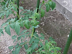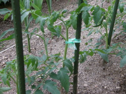 5月に植えつけた普通のトマトは すでに 実 を付け相当大きくなつています。そのわき目を切り取り 畝に挿したものが